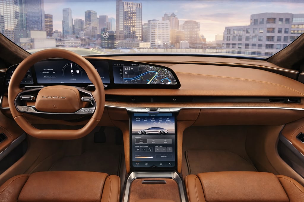 - Taking center stage is the Lucid Air’s distinctive Glass Cockpit – a 34-inch curved 5K display that spans from behind the steering wheel and sweeps toward the center of the dash. This high-resolution screen is actually three panels in one continuous glass surface: the left side for vehicle controls (lighting, wipers, etc.), the middle for digital gauges and speed, and the right side for infotainment (navigation, media, etc.). The graphics are crisp and modern, and the layout is reminiscent of a fighter jet or high-end Mercedes Hyperscreen, but with Lucid’s own UX design. Below this, in the center console, is a secondary retractable touchscreen (often called the “Pilot Panel”). This lower screen houses deeper controls: climate settings, seat adjustments, drive modes, charging settings, and more. It can retract up into the dash to reveal additional storage and a sleeker look when not needed.