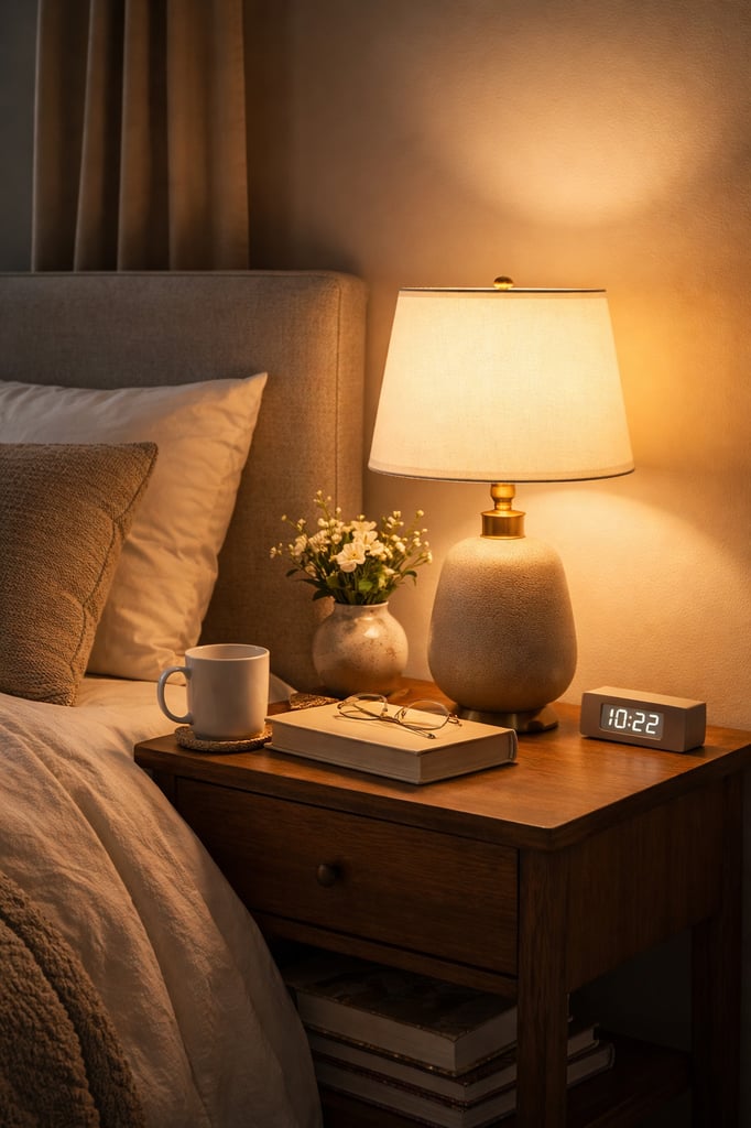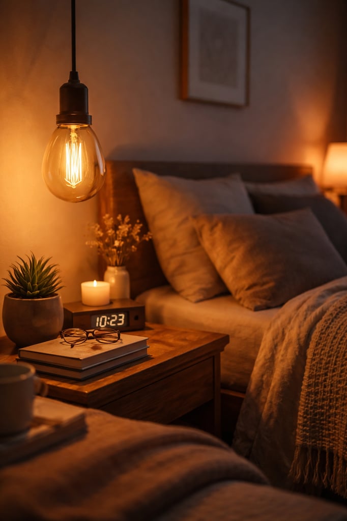 In a bedroom, a bedside lamp with a warm bulb creates a soothing glow. This kind of setup (warm white light on a nightstand) is ideal for reading or winding down before sleep.