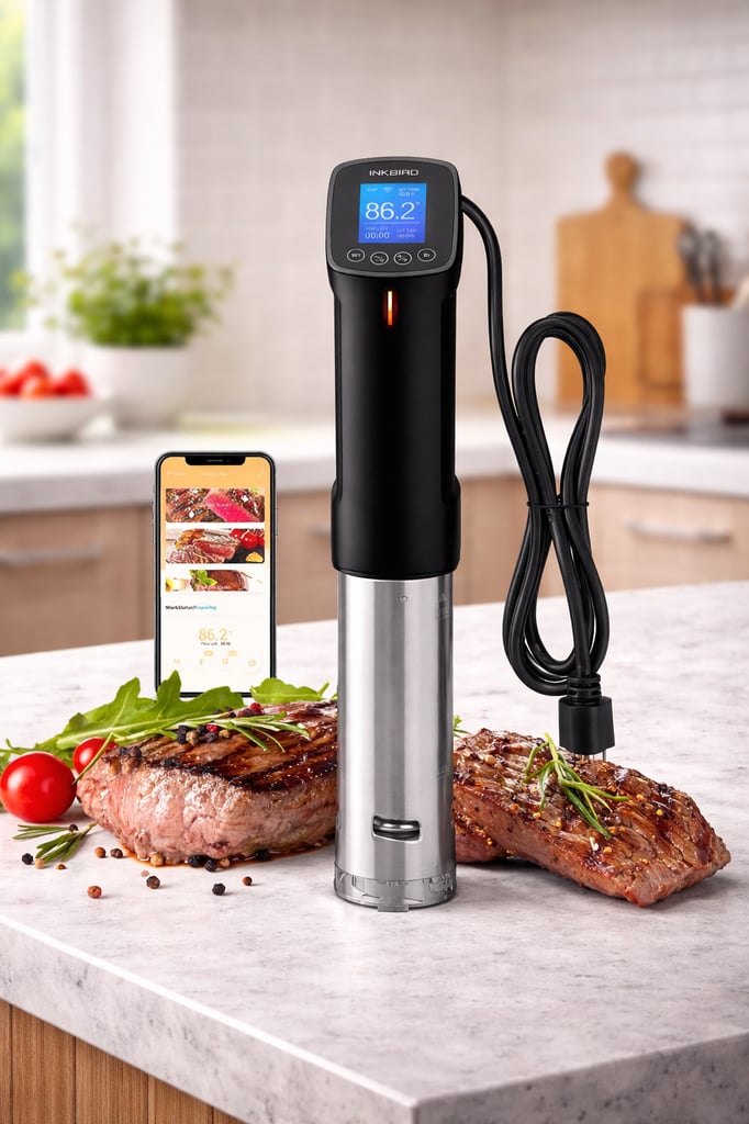 - Immersion circulator – Look for a model with at least 800–1,200 W of heating power for faster heat‑up times. Many models clamp onto pots and include a smartphone app for control.